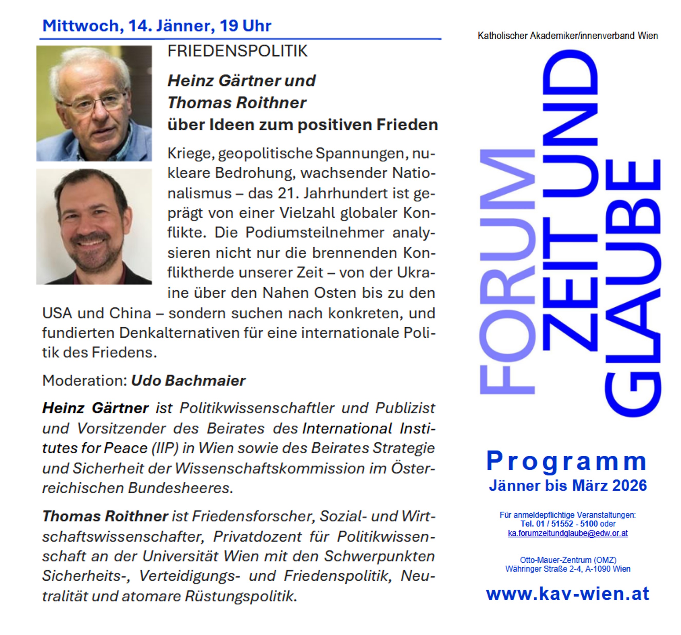 Friedenspolitik. Über Ideen zum positiven Frieden. Mit Heinz Gärtner und Thomas Roithner, Katholisches Bildungswerk Wien, Forum Zeit und Glaube, Programmhinweis, Otto-Mauer-Zentrum, Programm des OMZ Jänner - März, Wien.