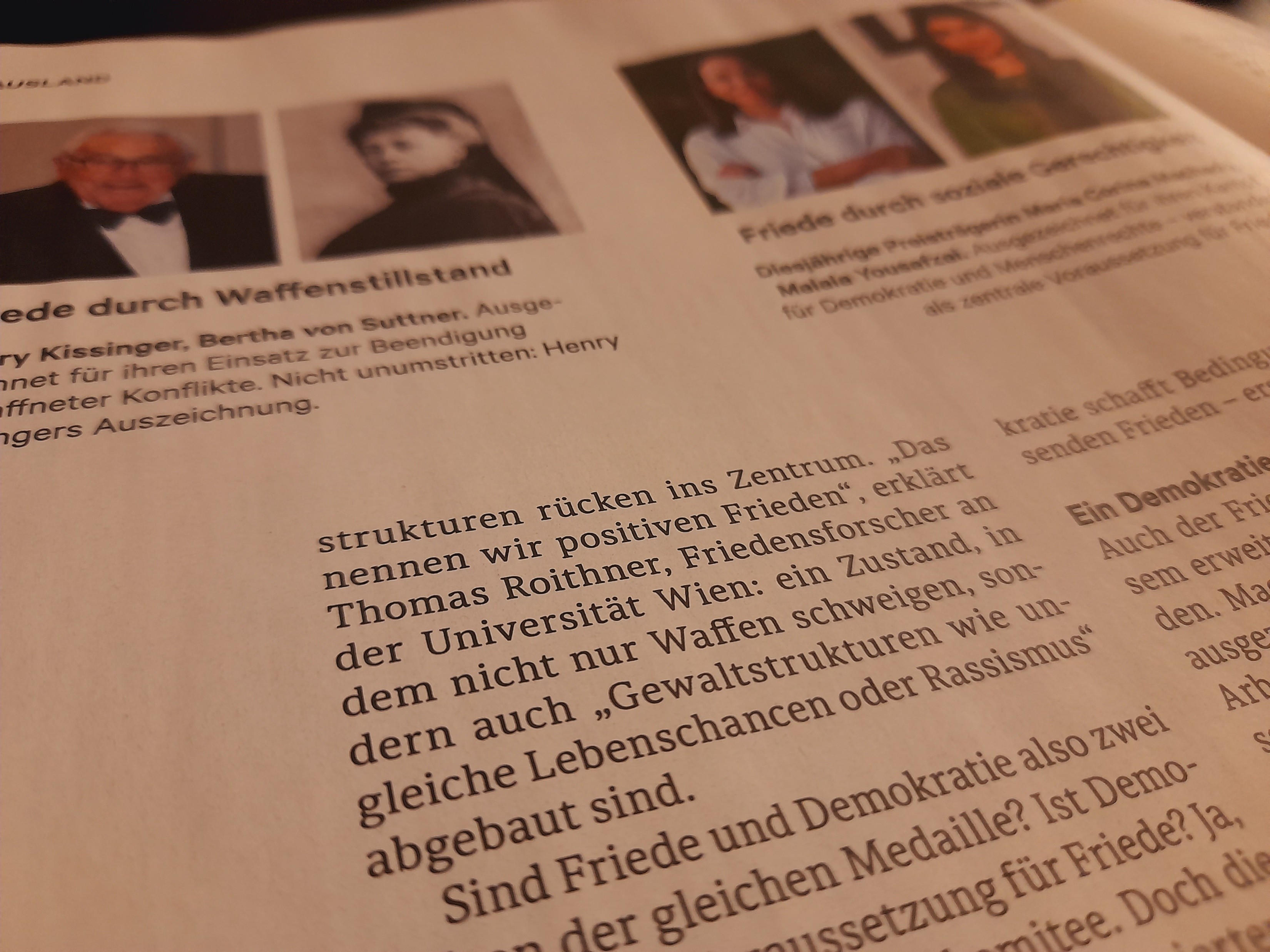 Thomas Roithner: Inspiriert von Bertha von Suttner 2.0. Friedensvision 2051: Österreichs Friedenspolitik schaut auf 30 Jahre zurück, in denen es ihr gelungen ist, weltweit den Frieden mit diplomatischen und zivilgesellschaftlichen Mitteln zu fördern, in: Die Furche. Die österreichische Wochenzeitung, Nr. 1/77. Jahrgang, 7.1.2021, Seite 2.